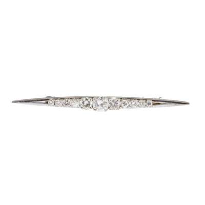 claw set with a row of ten round brilliant-cut diamonds, to a tapering bar brooch, unmarked