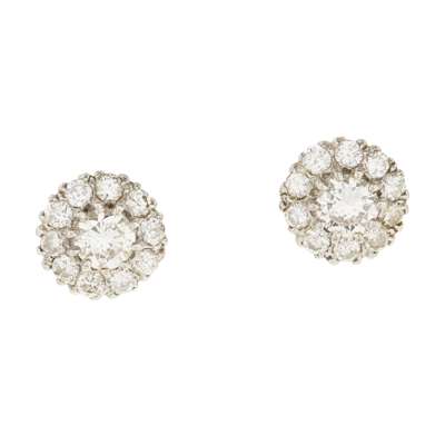 each claw set with a round brilliant-cut diamond, in a border of smaller round brilliant-cut diamonds, to post fittings, unmarked, in a fitted box for Garrard & Co