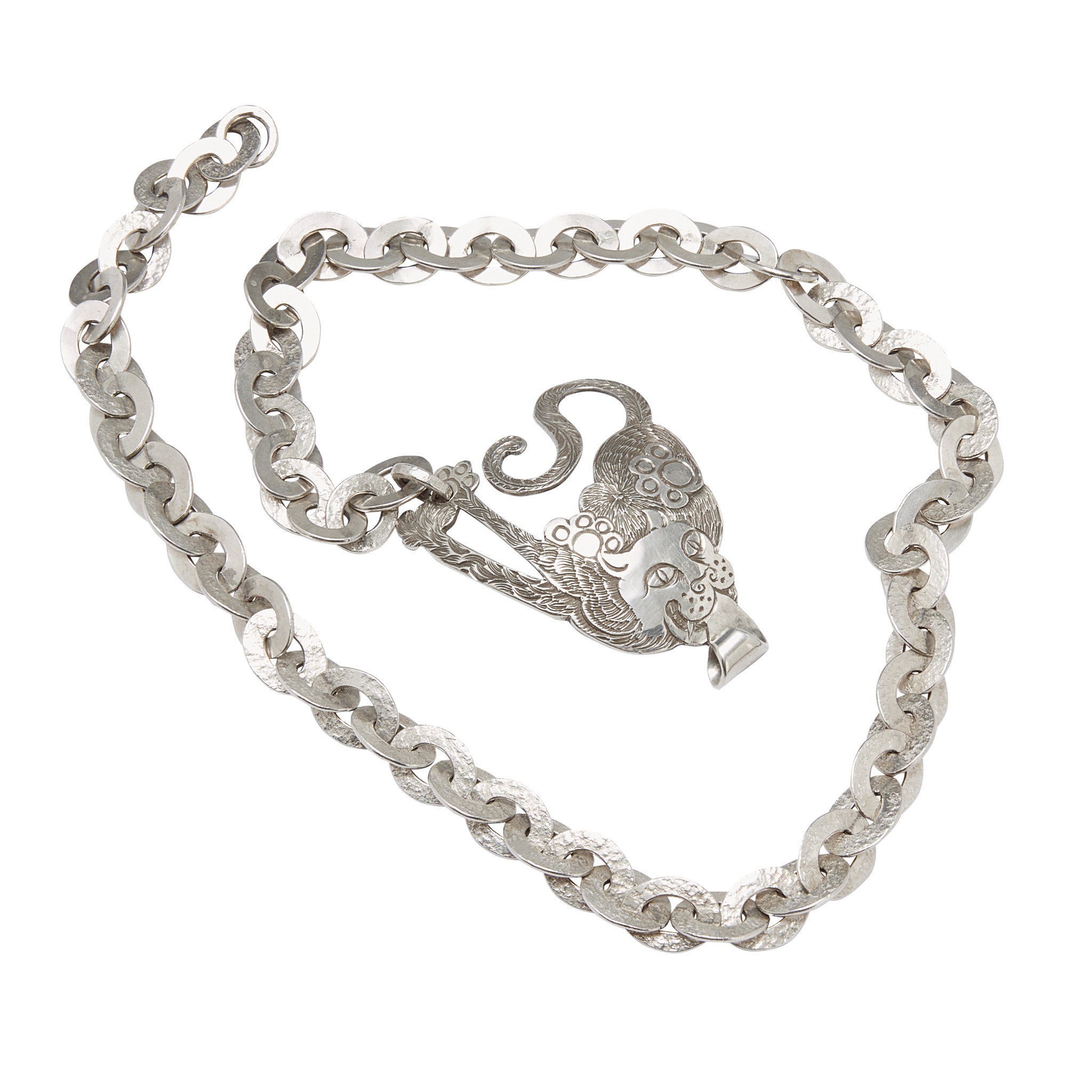 composed of a single strand of textured links, the feature clasp modelled as a cat with engraved detail