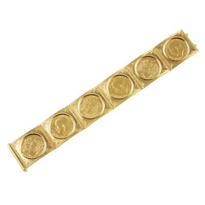 composed of six various sovereigns mounted in articulated plaques with engraved foliate borders, to a concealed push spring clasp, unmarked