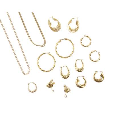 to include two 9ct flattened curb link neck chains, a pair of large 9ct gold rope twist hoop earrings and a similar smaller pair, stamped 375; together with two pairs of 9ct hoop earrings, another pair, unmarked; a pair of stingray pendant earrings marked 14k and a single unmarked hoop (qty)