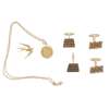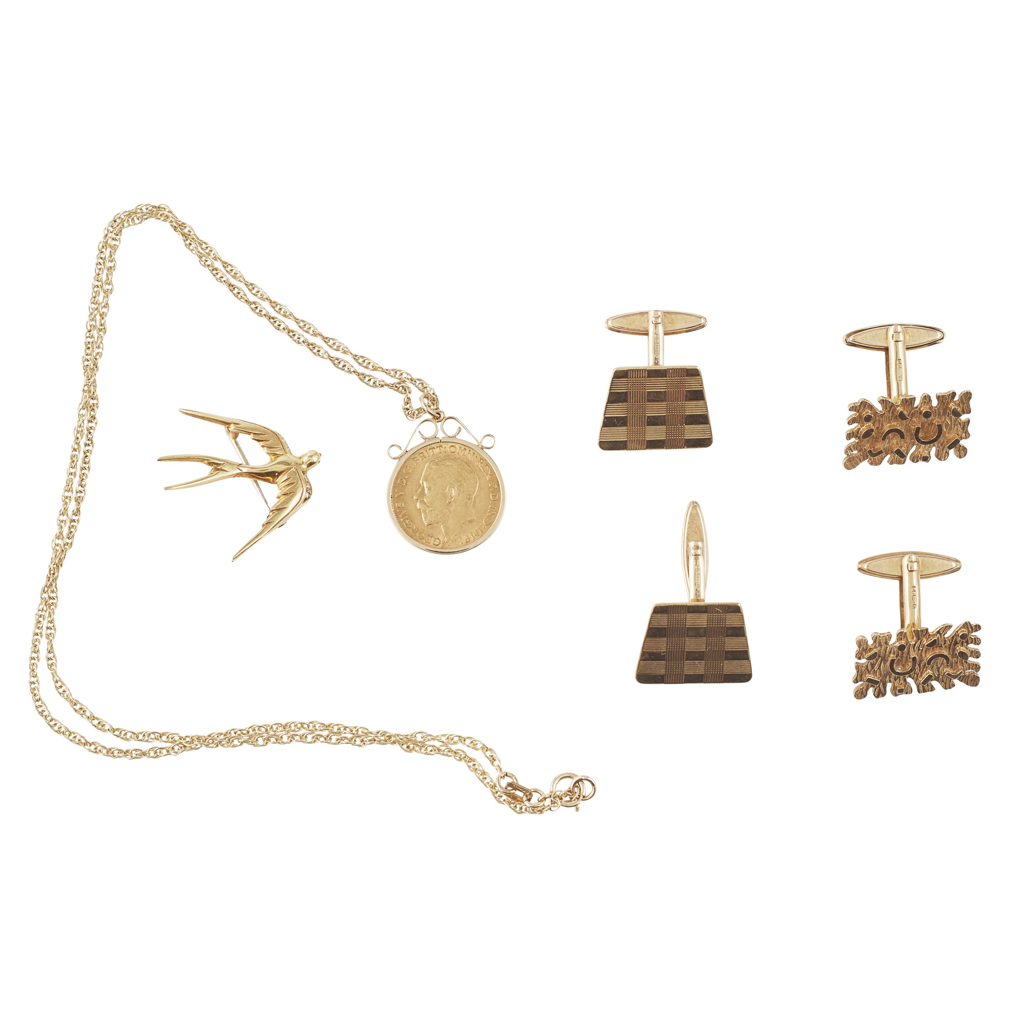 mid-20th century, one textured with applied motifs, the other chequered, both with swivel terminals; together with swallow brooch, stamped 750 and a gold mounted half sovereign pendant and chain (4)