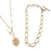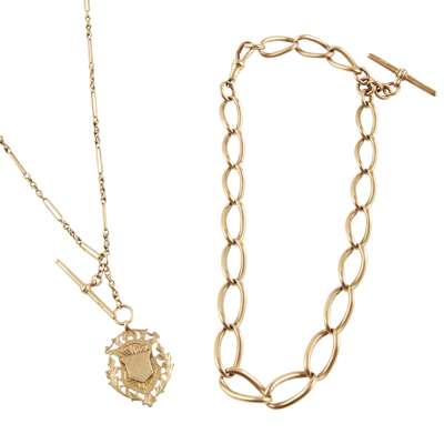 to include a 9ct gold elongated curb link watch chain with T-bar clasp; a 9ct gold fancy link watch chain with T-bar suspension and pendant medal; a 9ct gold bi-coloured watch chain with T-bar pendant (3)