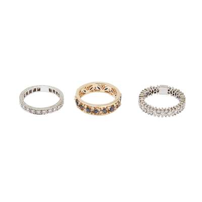 to include a platinum and diamond set eternity ring, composed of a continuous row of round brilliant-cut diamonds; together with another composed of alternating marquise and pairs of round brilliant-cut diamonds; and an 18ct gold sapphire and diamond set eternity ring (3)