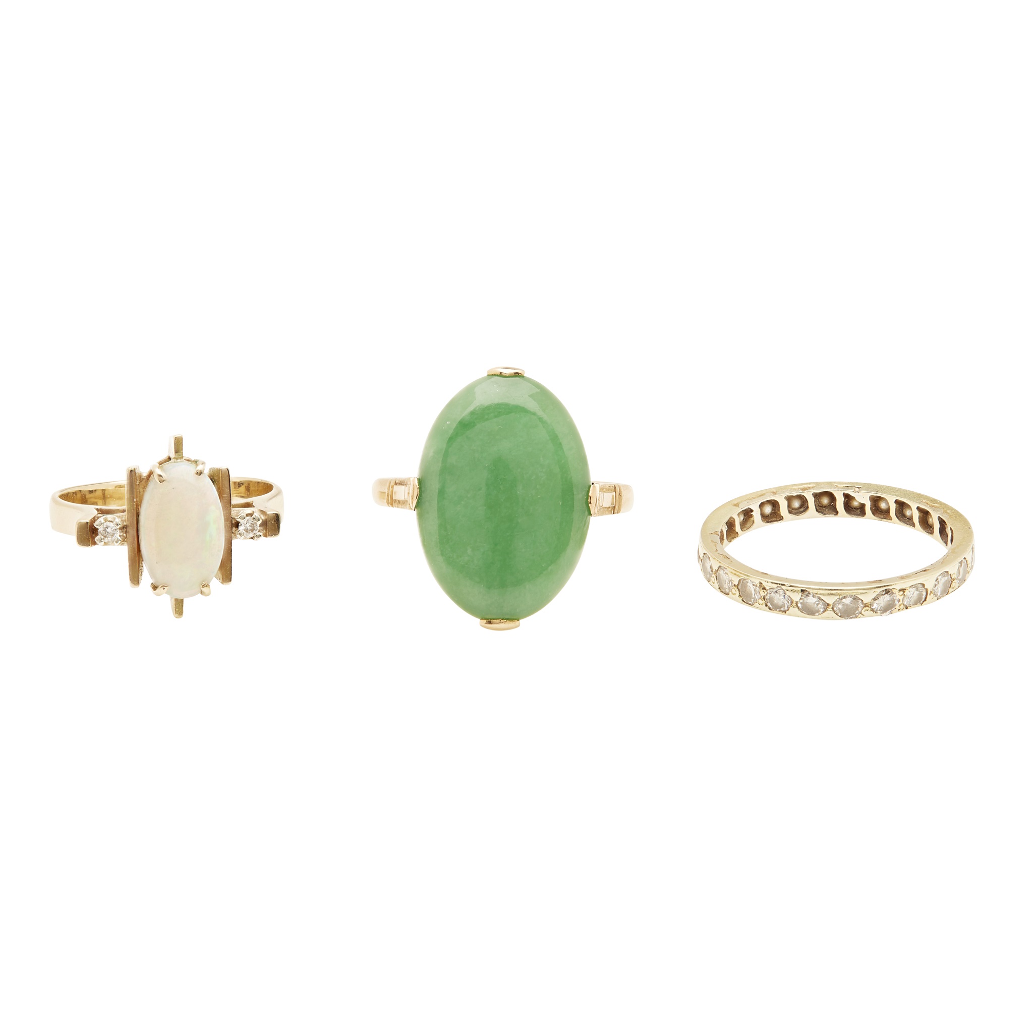 to include a cabochon jade set ring, indistinctly marked; an opal and diamond set ring, stamped 375; and a diamond set eternity ring, unmarked (3)
