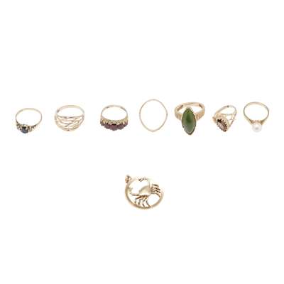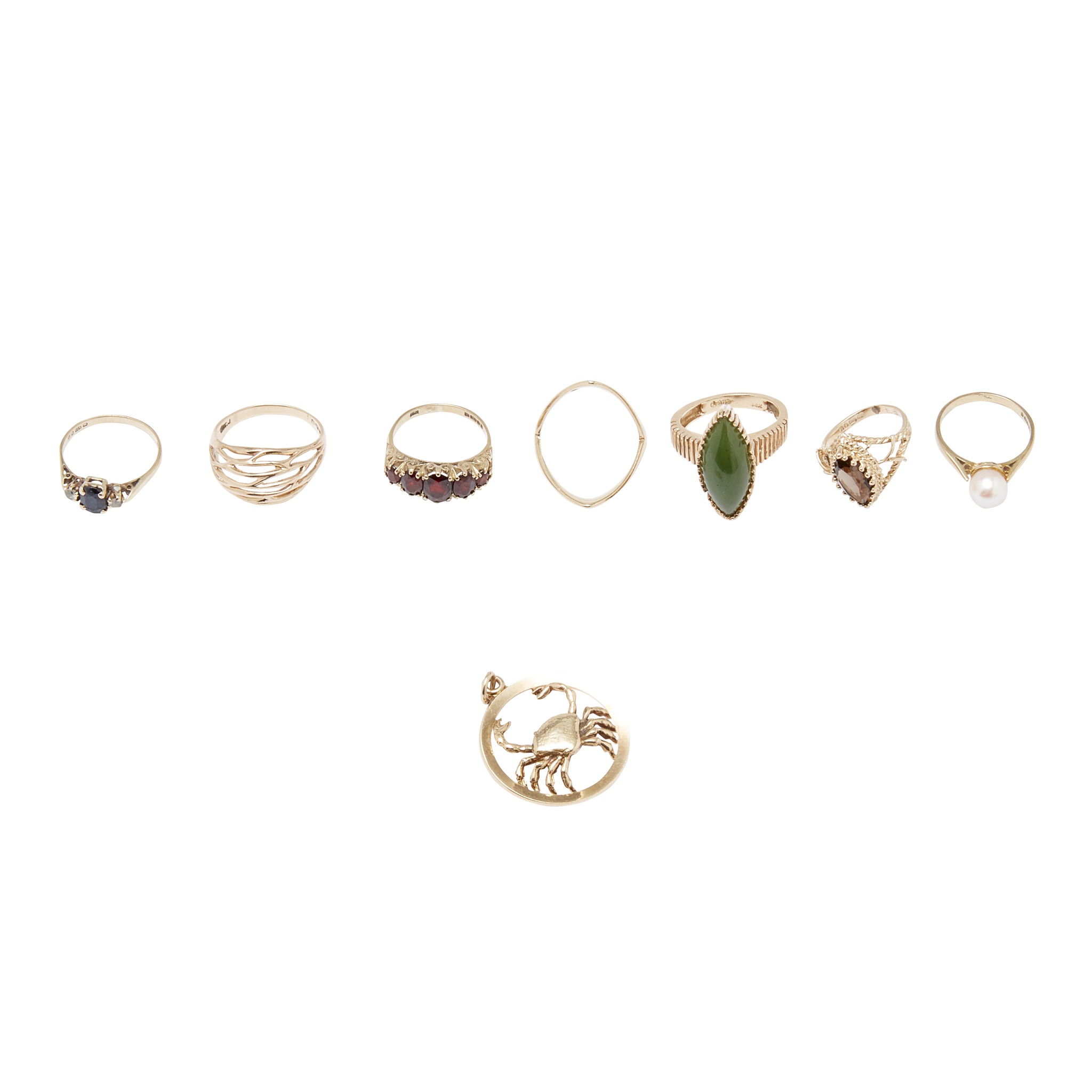 to include a 9ct five stone garnet set ring, a 9ct sapphire and paste set ring; a 9ct gold cultured pearl set ring, a textured ring with navette jade cabochon marked 14K; together with a 9ct citrine set ring and two further 9ct rings and pendant (8)