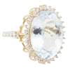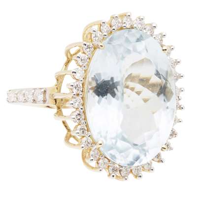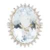claw set with a large oval mixed-cut aquamarine in a border of small round brilliant-cut diamonds, each shoulder set with five round brilliant-cut diamonds, to a plain 18ct gold shank