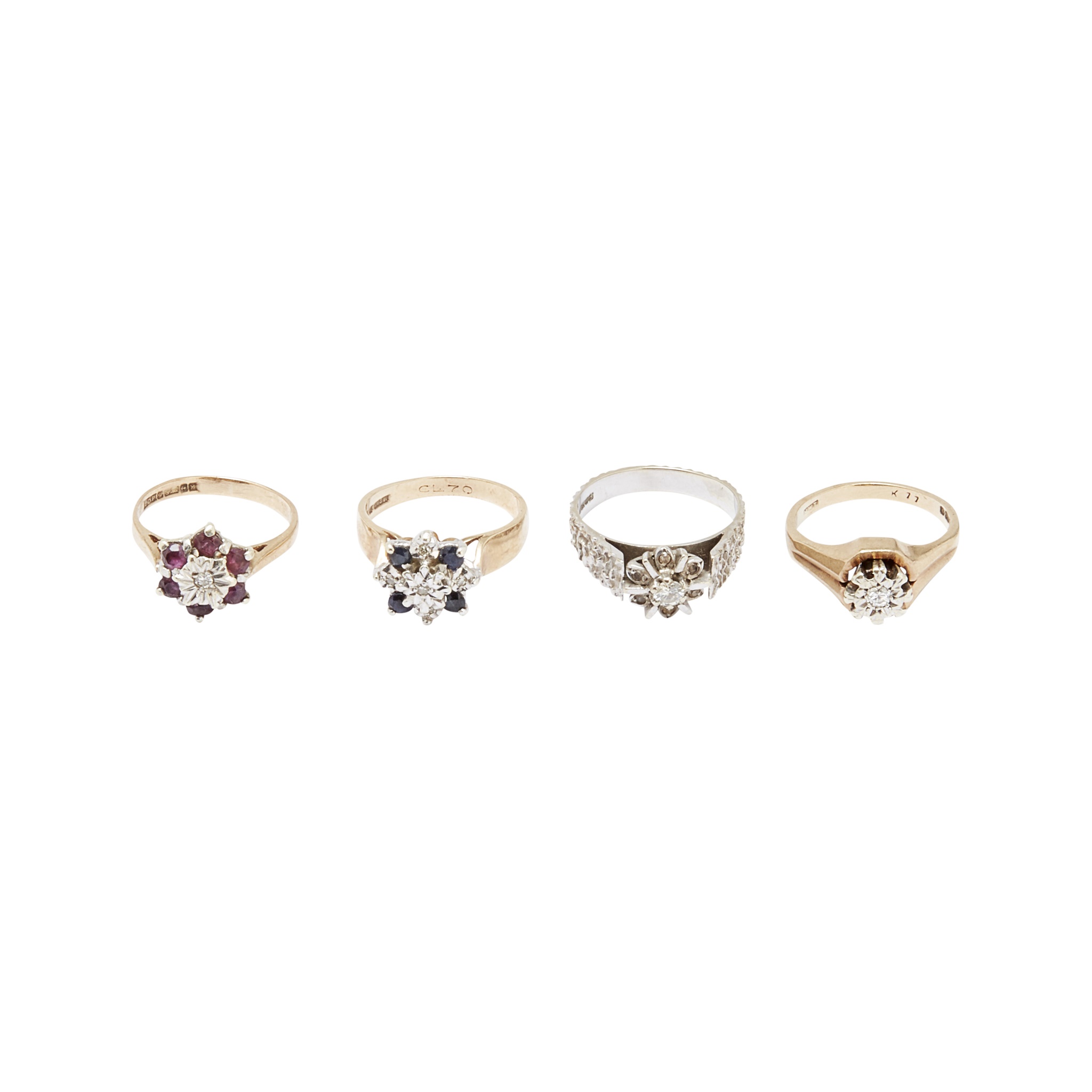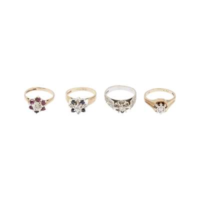to include a 9ct gold sapphire and diamond set cluster ring, an 18ct white gold diamond set cluster ring, a 9ct gold single stone diamond ring and a 9ct gold ruby and diamond set cluster ring (4)