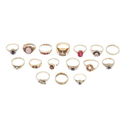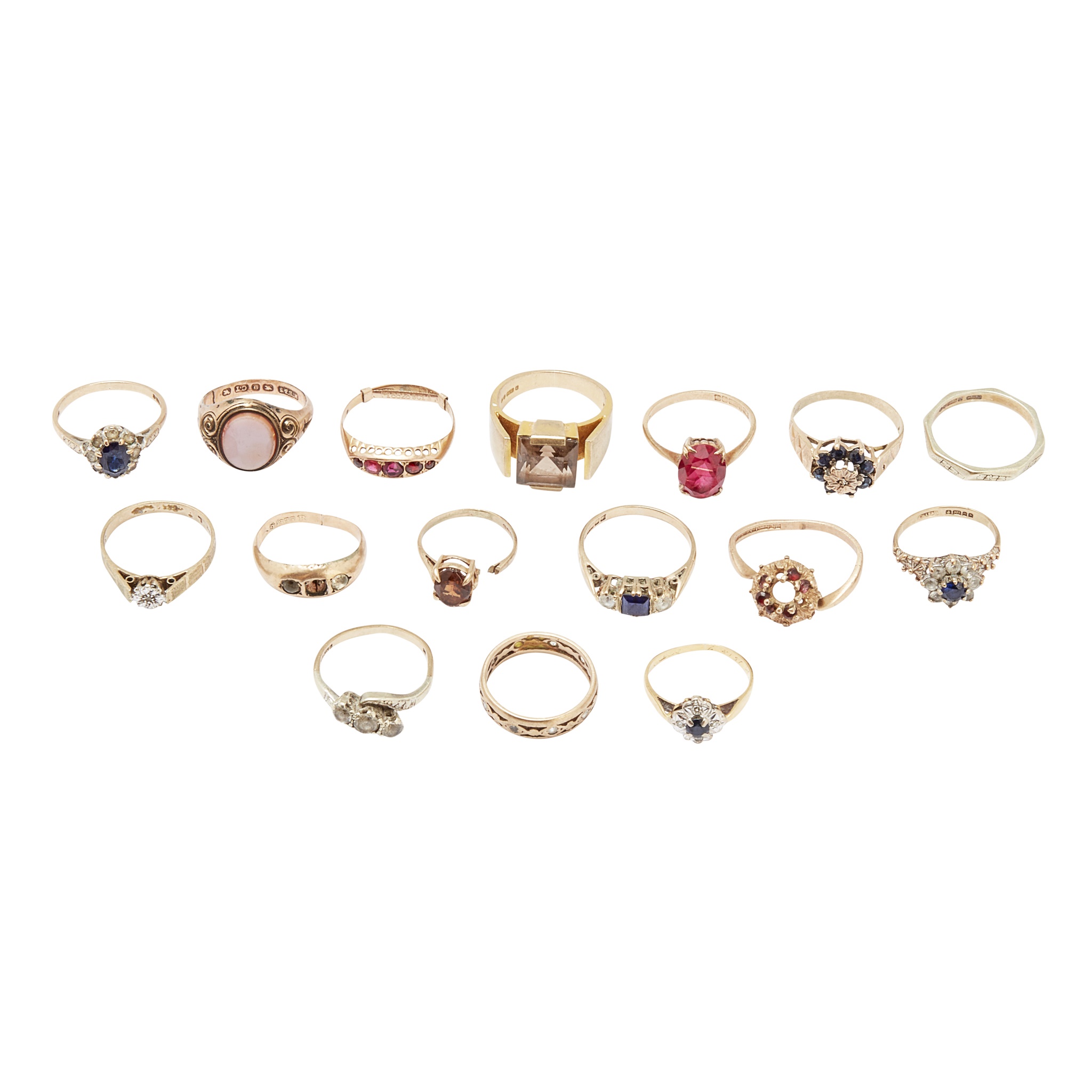 to include a large citrine set cocktail ring, an agate set signet ring; a plain octagonal band, various other gem set rings (16)