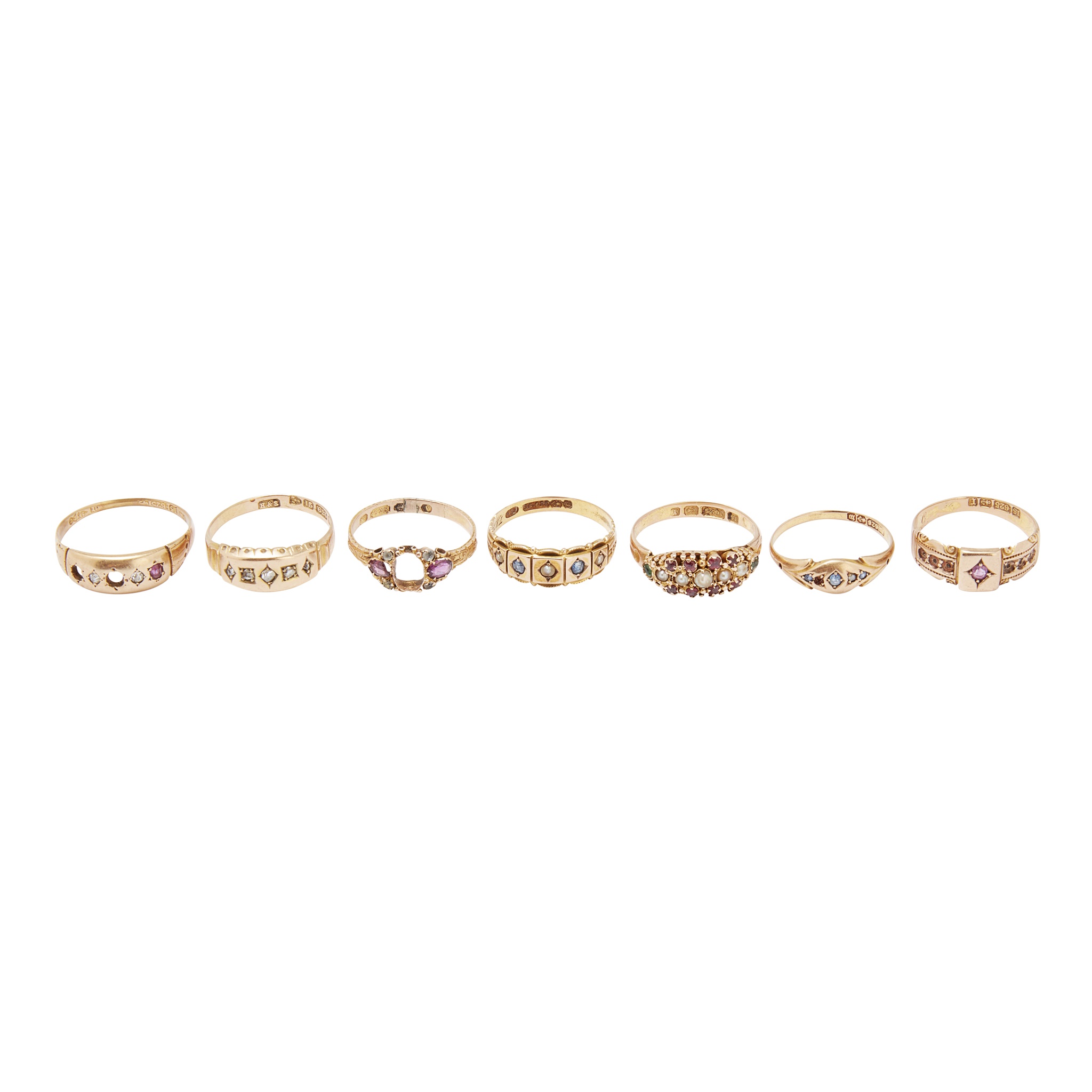 to include a five stone diamond-chip set ring, a sapphire and pearl set ring; a multi-gem set cluster ring and various other gem set rings (some stones deficient), all hallmarked (7)