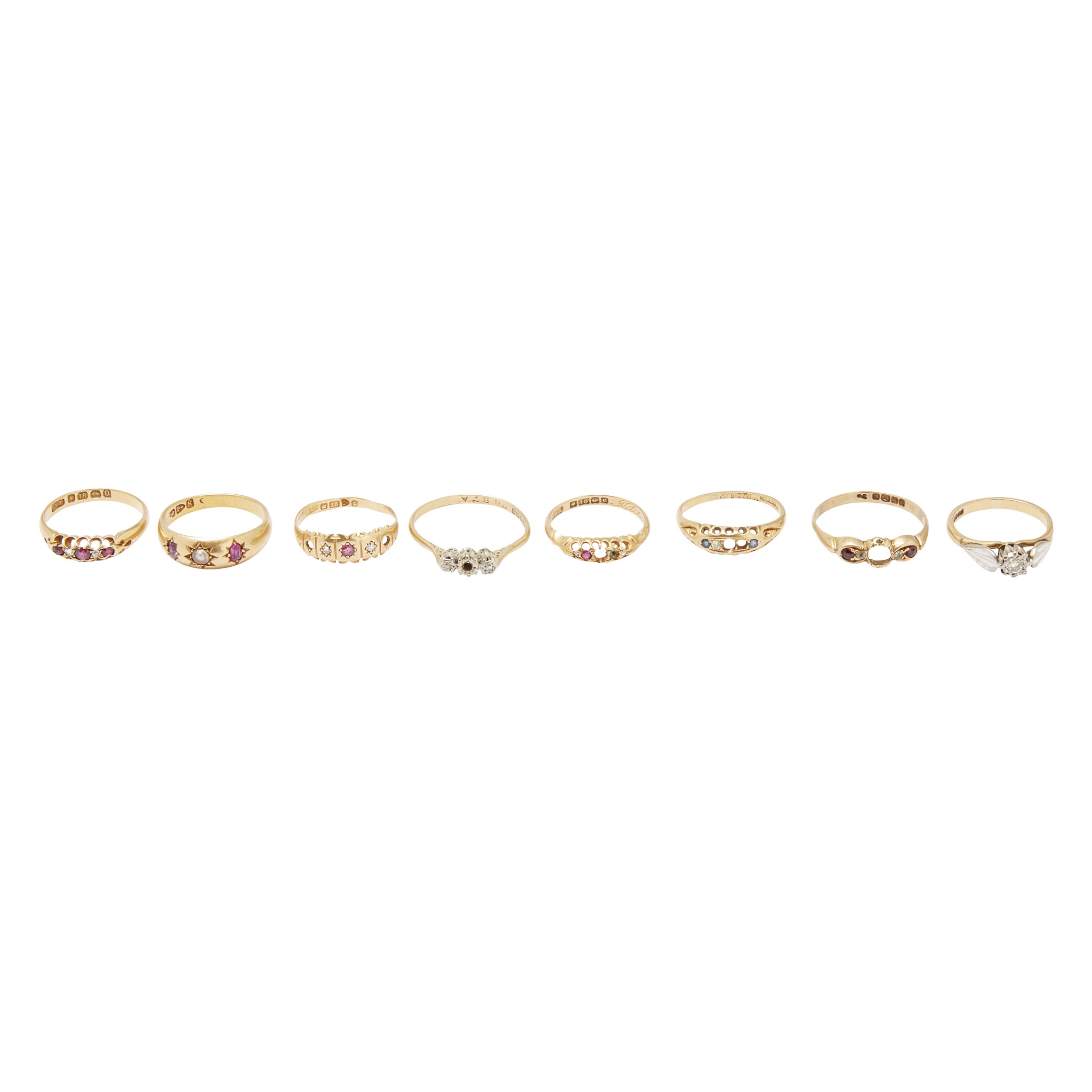 to include an illusion set single stone diamond ring, a ruby and pearl set three stone ring; a five stone ruby and diamond ring, and various other gem set rings (some stones deficient), all hallmarked (8)