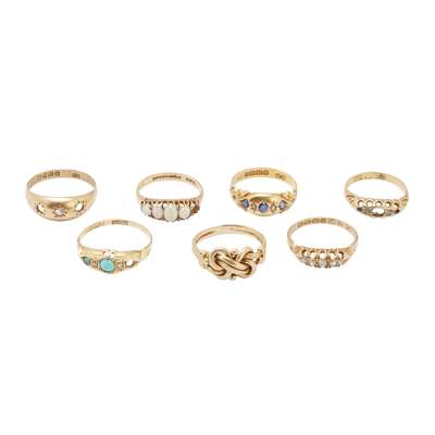 to include a five stone sapphire and diamond set ring, a five stone diamond set ring; a ring with engraved knotted detail; various other gem set rings (some stones deficient), all hallmarked (7)