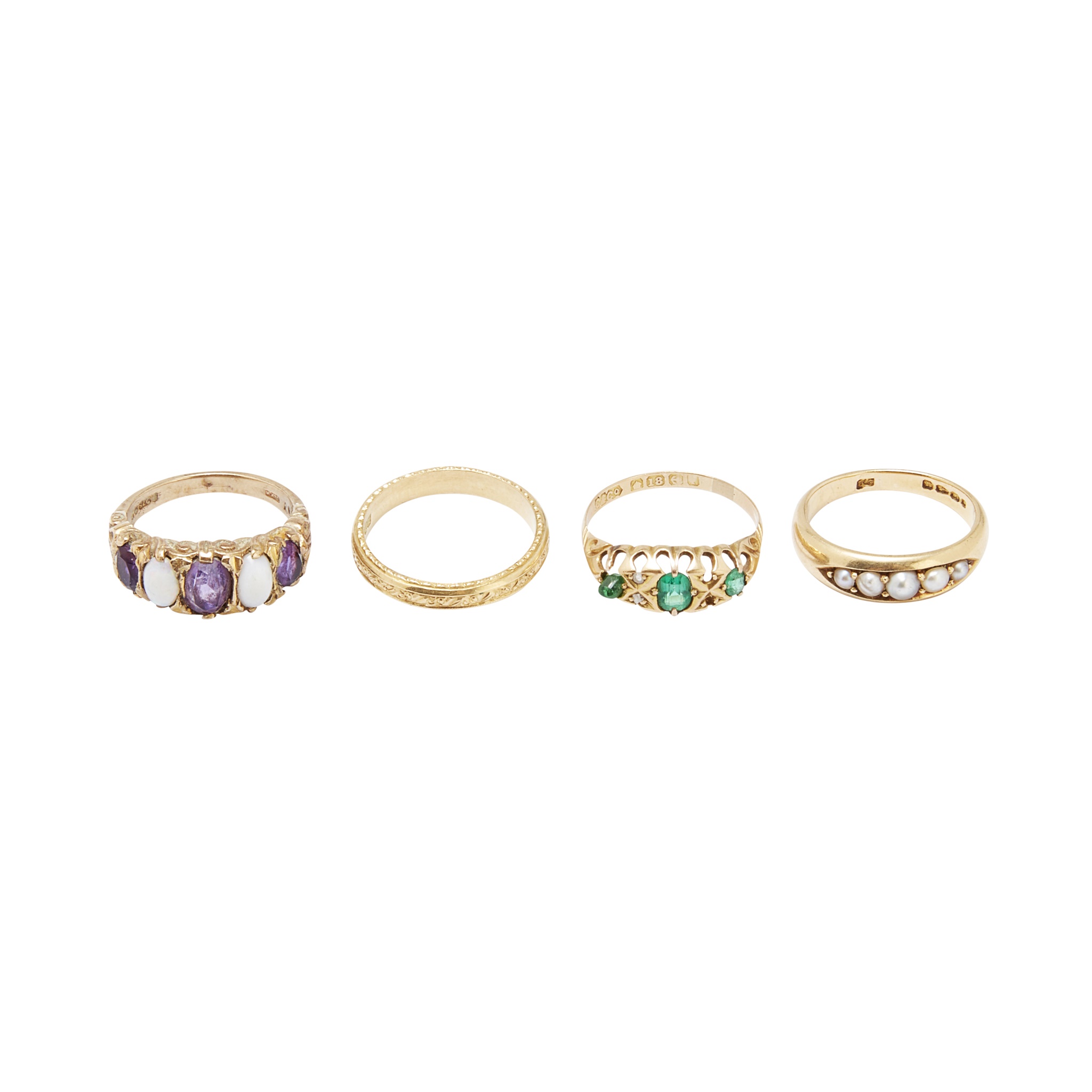 to include a 9ct gold amethyst and opal set ring; an2 18ct gold emerald and diamond set ring; an 18ct gold pearl set ring and an 18ct gold engraved wedding band (4)