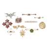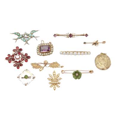 to include a pearl set brooch modelled as an oak leaf and acorn, another modelled as fleur-de-lis, unmarked; a circular jade set brooch and a moonstone set bar brooch, unmarked; an amethyst and pearl set cluster brooch, a turquoise set 'bird' brooch, unmarked; a floral foil-backed red gem set cluster brooch and three further gem set bar brooches, an unmarked yellow metal locket (11)