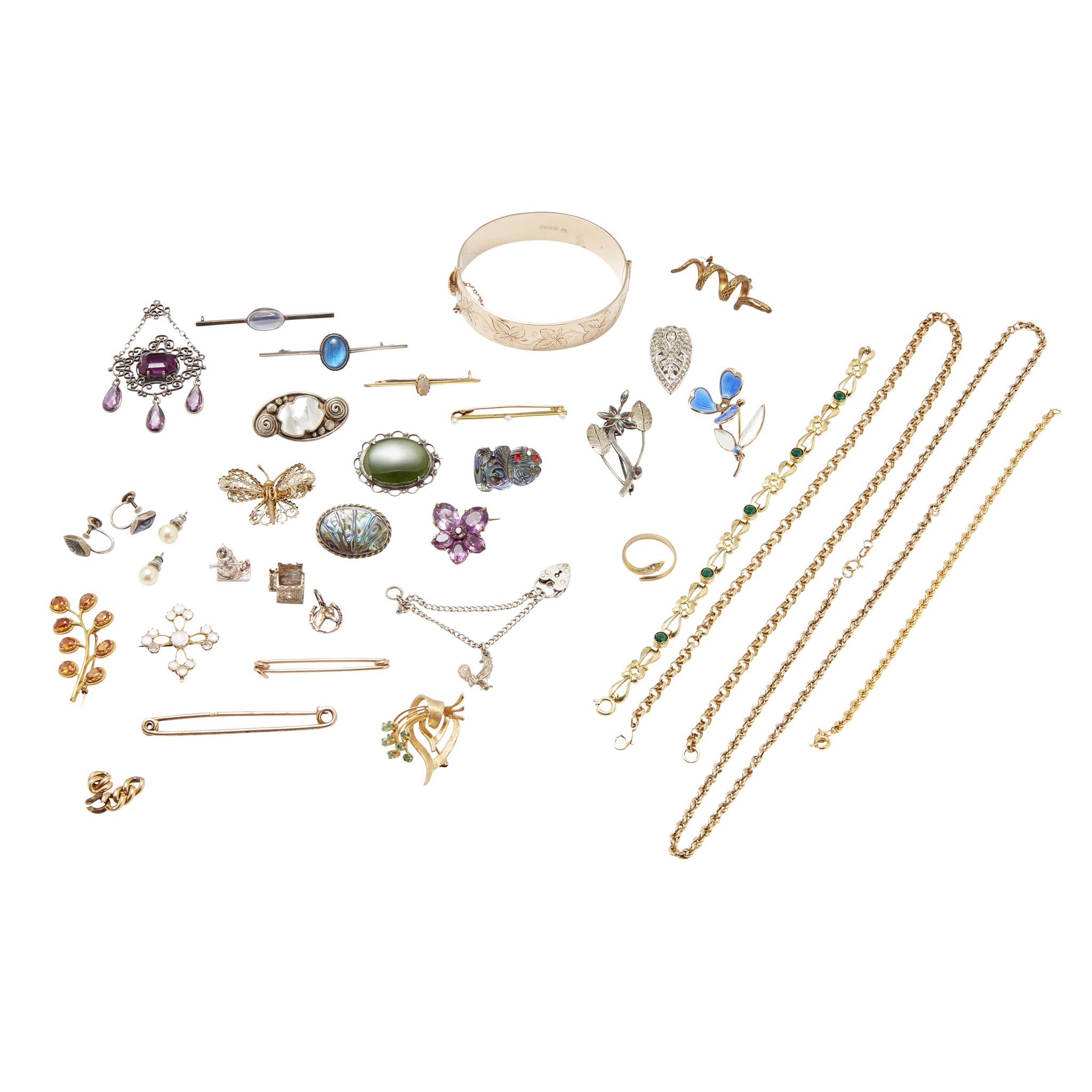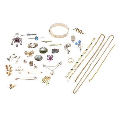 to include a 9ct gold belcher link chain, a 9ct gold rope twist chain; a similar bracelet stamped 14k, an emerald set brooch, stamped 14k; two nappy pins stamped 9ct; various other brooches, earrings and bracelets etc. (qty)