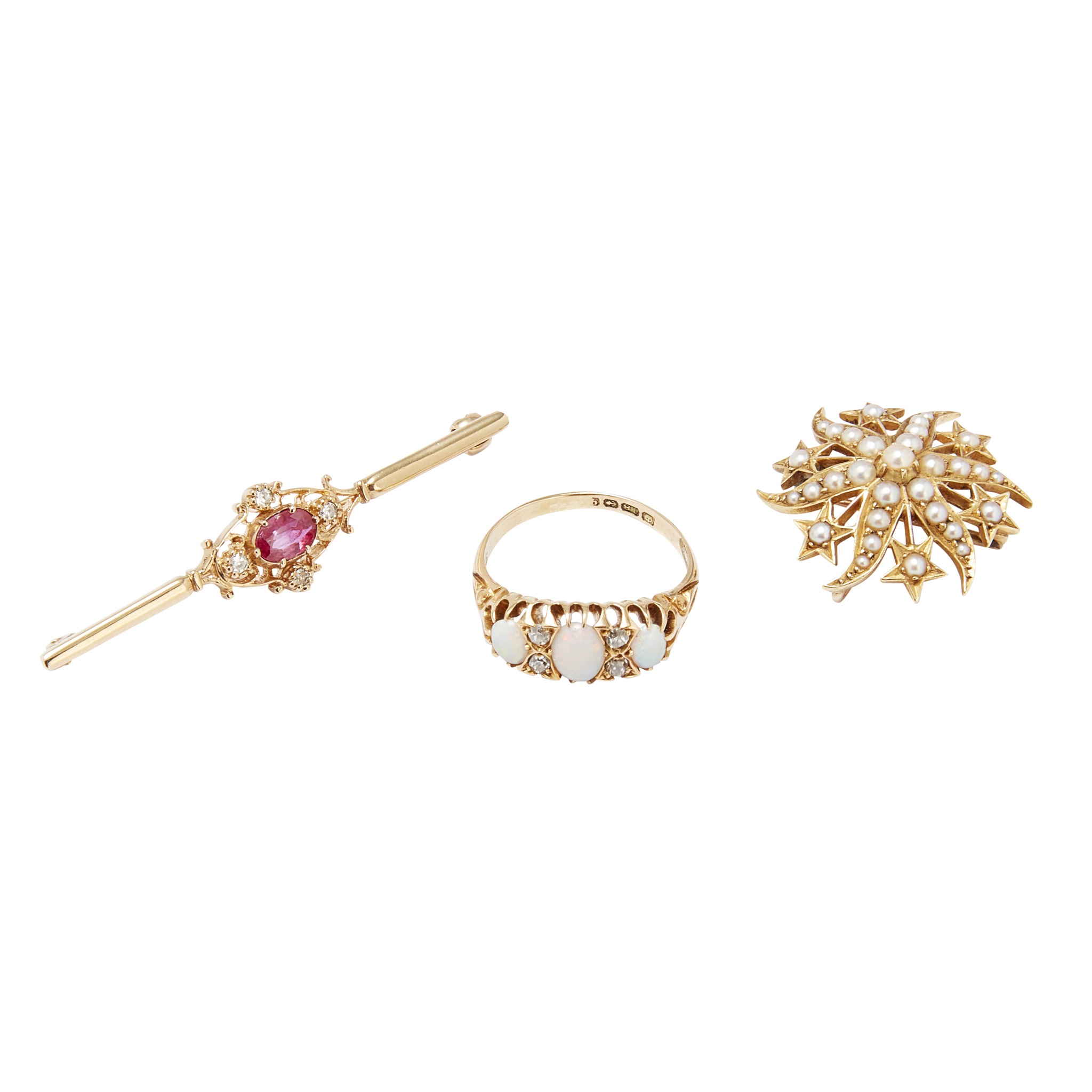 to include an 18ct gold opal and diamond set ring; a 9ct gold ruby and diamond set bar brooch; and a seed pearl set star brooch, unmarked (3)