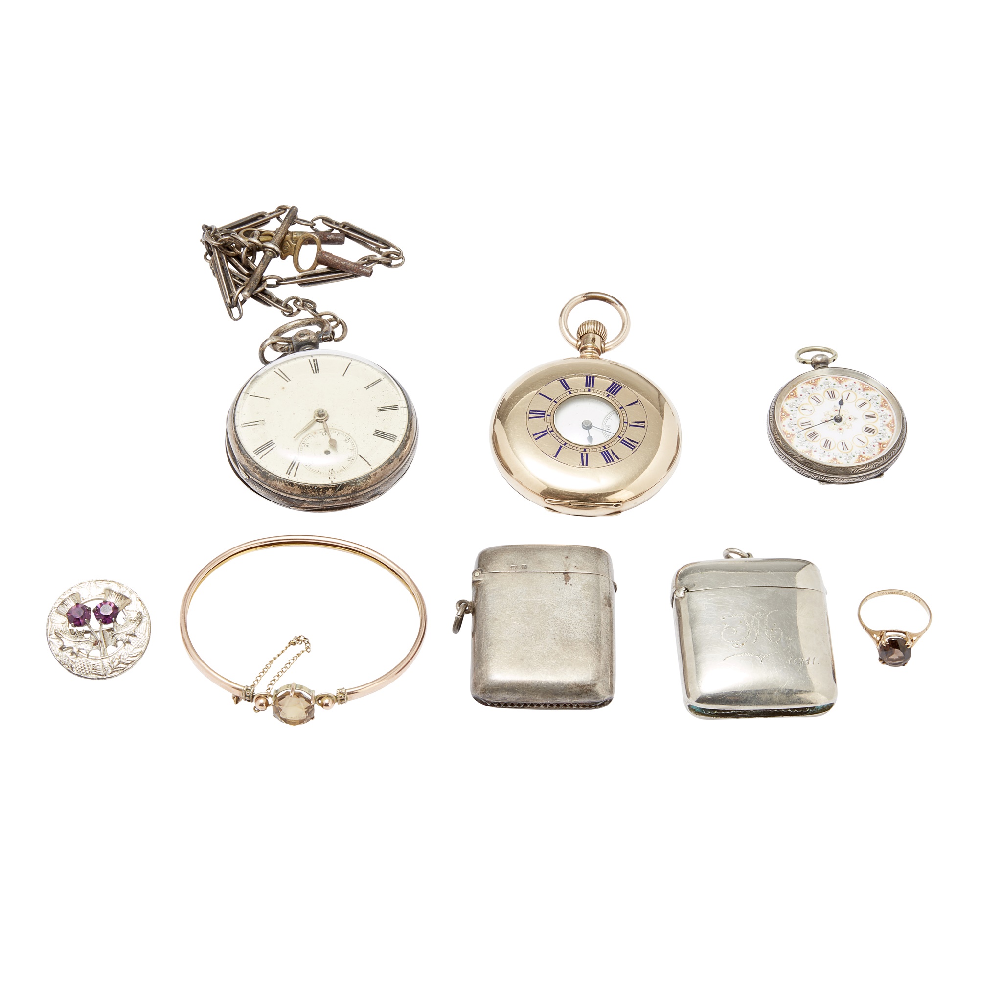 to include a citrine set bangle stamped 9ct, and a 9ct gold citrine set ring; a paste set Scottish brooch, two vesta cases; a gilt metal half-hunter cased pocket watch, a silver cased open-faced pocket watch, with associated watch chain, and a small open faced fob-watch (9)
