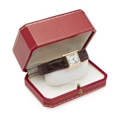 Tank model, plain rectangular dial, Roman numerals, sapphire crown, manual movement, plain leather strap with gold deployant fold over clasp, in box with spare Cartier strap