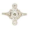 millegrain set with three graduated old round-cut diamonds in a pierced surround, the shoulders each pavé set with rose-cut diamonds, to a plain yellow metal shank with indistinct marks