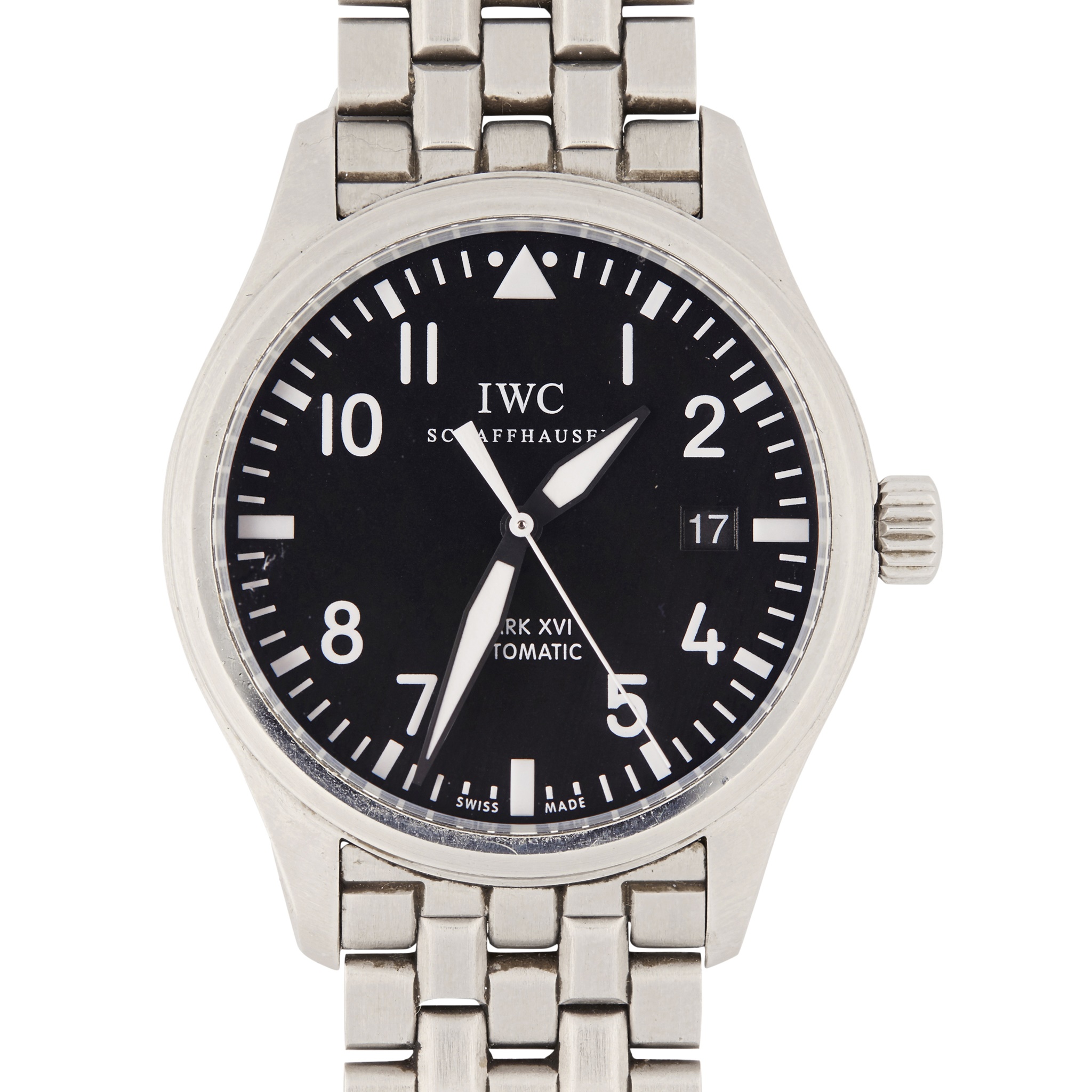 Fliegeruhr MK XVI, pilot's watch, plain stainless steel case, black dial with clear Arabic numerals, sweep second hand and date aperture, screw down crown, automatic movement, satin finished brick link bracelet, with box and papers