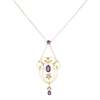 of open scrolling form, set throughout with seed pearls and a central oval amethyst, suspending a small seed pearl and amethyst drop, unmarked, to an integral 18ct gold trace link chain