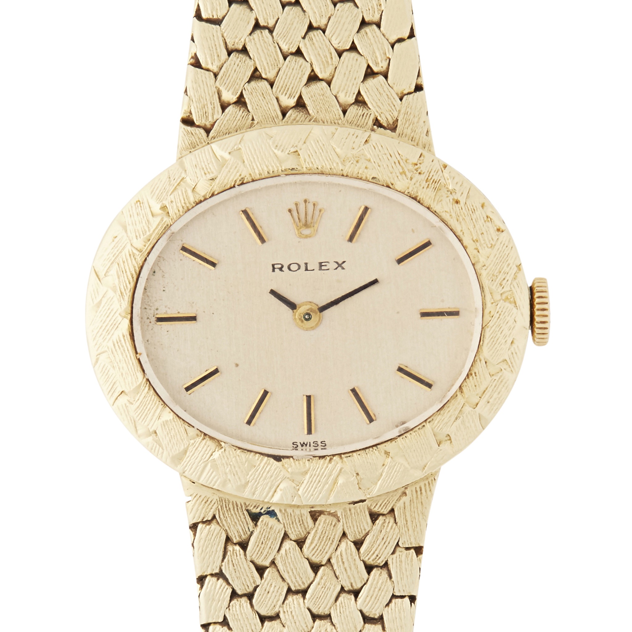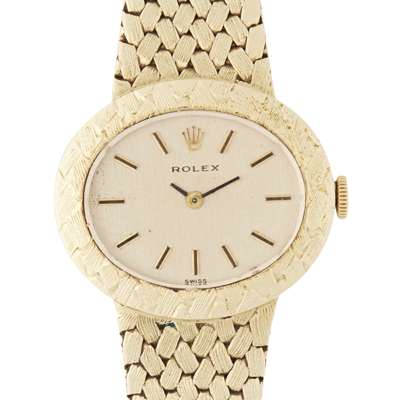 Cal. 1400, the oval silvered dial with baton indicators, the bezel, lightly engraved textured effect as is the integral bracelet, fold over clasp