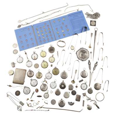approximately twenty seven silver cased pocket watches, open faced, lever and pair cased, fob and pocket watches; ten pairs of sugar tongs including Scottish 19th century and others, various coins, pin tray, neck chains, small ingots etc., vesta cases, Scottish brooches etc., sovereign keeper etc., pair glove stretchers large group of silver Alberts (qty)