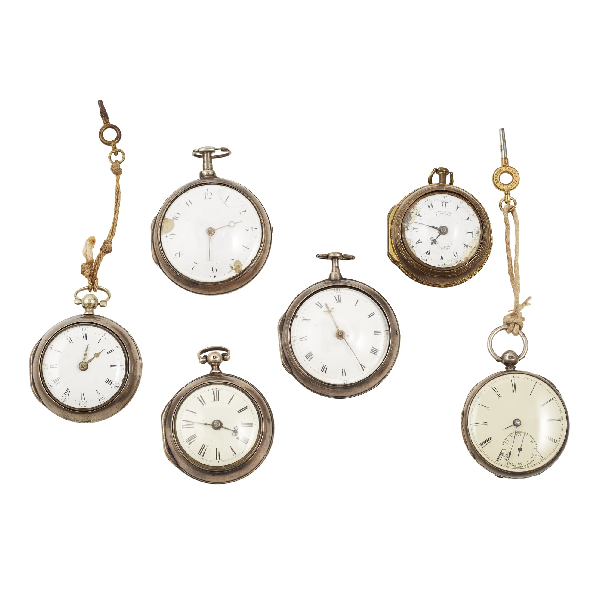 the first Scott and Coutts London, plain dial, Roman numerals, gilt hands, verge movement, signed; the second, Mitchell Russell, Glasgow, domed white enamel dial, Arabic numerals, verge movement, signed, plain outer case; the third Markwick Markham, Perigal London, small size, enamel dial marked for Turkish market and inscribed, the verge movement inscribed and numbered in Turkish, gilt case; the fourth, Richard Thaine London, later dial, verge movement signed and numbered, 2813, plain cases; the fifth, J Richards Liverpool, white dial with Roman and Arabic numerals, movement signed and numbered 844; and a silver cased English lever pocket watch (5)