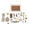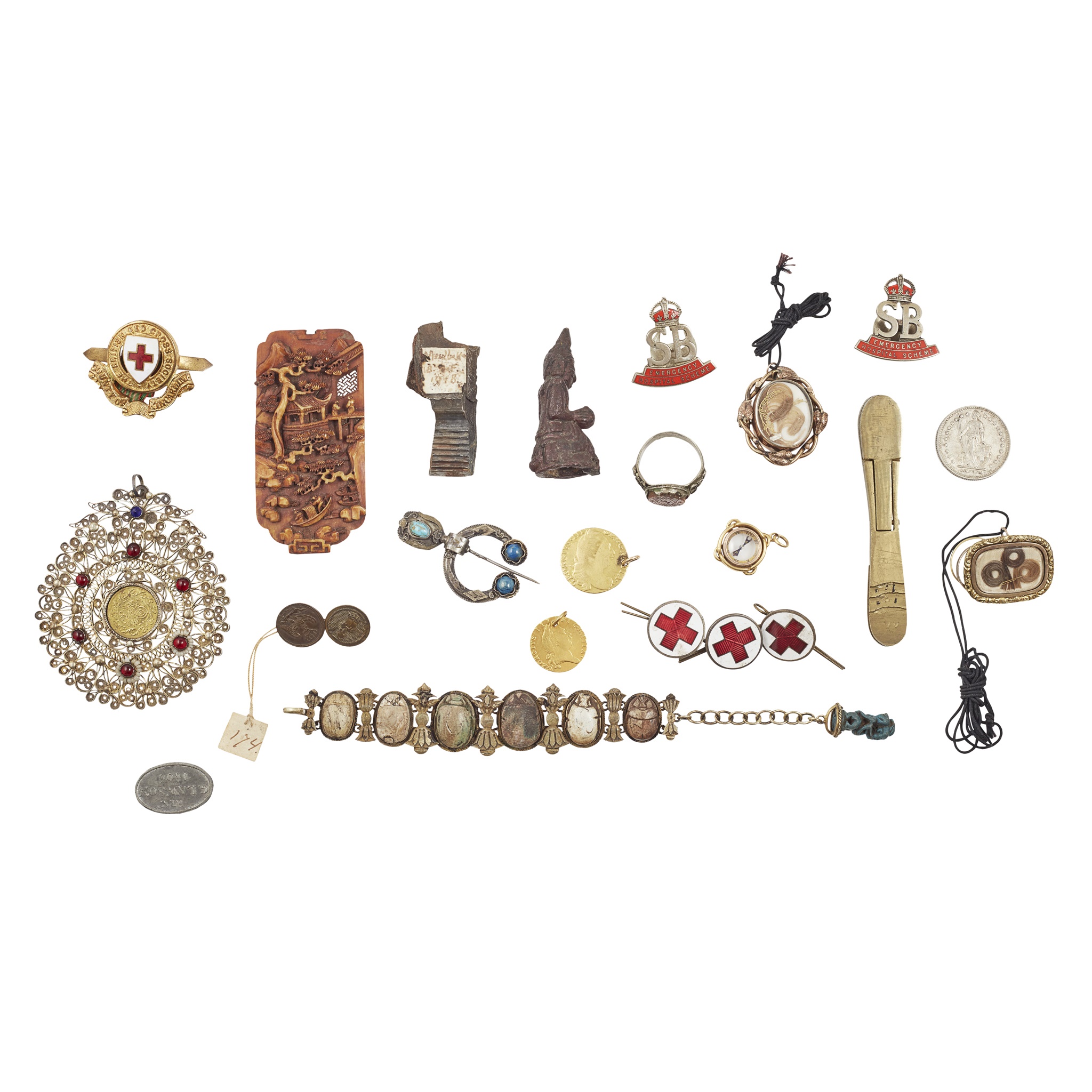 both drilled, 1775 and 1788; a large filigree pendant of round form, small eastern coin to centre, gem set detail to the ground; a small gold mounted compass fob; a Georgian momento mori brooch and another later; a filigree mounted bracelet with ancient Egyptian inset scarabs and a bes figure with a blue glazed charm appendage; sewn silk panel and woven ribbon; miscellaneous other objets trouvé (qty)
