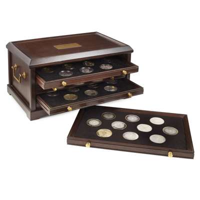 fifty silver proof coins by John Pinches, all in a case with drawers