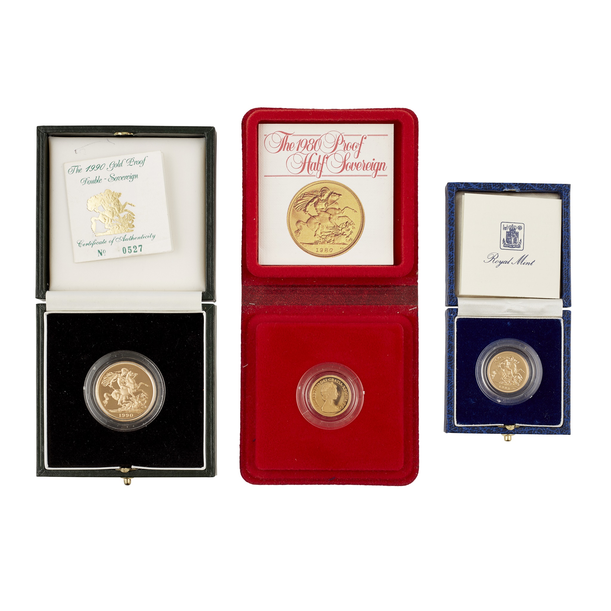 £2 1990, half sovereigns, 1983 and 1980, as issued with papers (3)