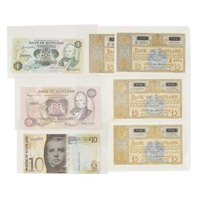 £1 x 2 Polworth, Letham, Mar 1967 P105b: £1 Polworth, Letham, July 1968, A/1 Prefix P109a; £1 x 2 Polworth, Letham, P109b; £1 x 6 1974, 75, 77, 81, 83, 84, P111; £5 x 2 Bilsland, Watson Sept 1961 P103; £5 Bilsland, Watson Jan 1965, P106a; £5 x 2 Bilsland, Watson, Mar 1966 P106b; £5 x 3 Clydesmuir, Pattullo 1973, 1979, 1980 P112; £10 x 3 Risk, Patullo, 1984, 1986, 1989, Risk Burt, P113; £20 Patullo, Burt, Feb 1992 P118; £1 Risk Patullo Nov 1986 P111f: £10 Stevenson Matthew, Sept 2007 P125 (qty)