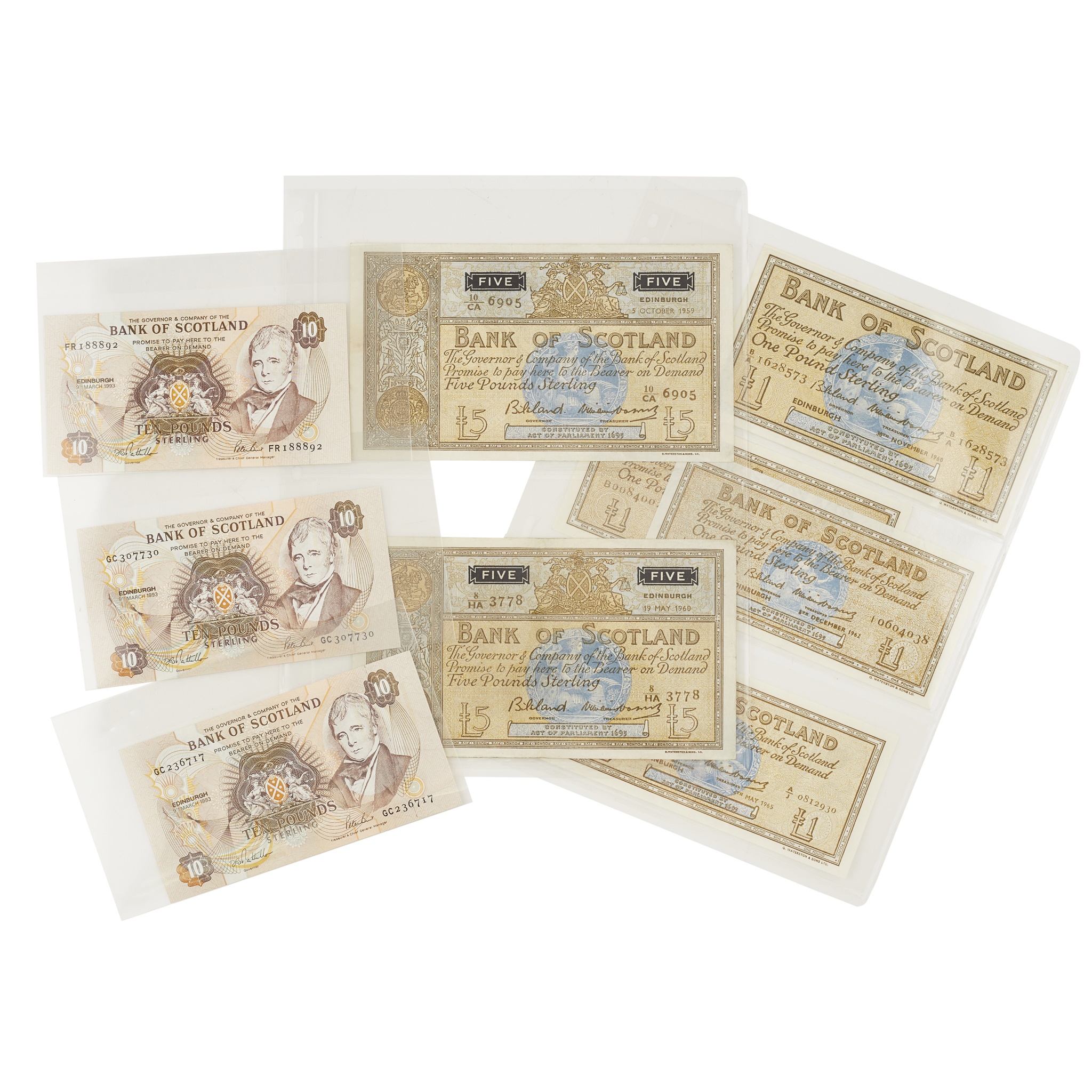 £10 Grant, Masterton, Aug 1998, P120c; £10 x 2 Shaw, Mitchell, June 2001 P120d; £10 x 2 Mitchell, Nov 2003, P120e; £5 x 2 Risk, Patullo, June 1982, 1984 P112e; £5 x 2 Risk, Patullo, Dec 1985, P112f; £5 Bilsland, Watson, Oct 1959 P103?; £5 Bilsland, Watson, May 1960 P101c; £5 Polworth, Letham, Nov 1 1968, P110a; £1 x 3 Risk, Patullo Nov 1986, Dec 1985, P111f; £1 Clydesmuir, Russell, Z/2 prefix, P111c; £1 x 2 Clydesmuir, Patullo, Oct 1979, Nov 1980, P111d; £1 x 4 Bilsland, Williams, Nov 1960, Nov 1961, Dec 1962, May 1965, P100c and P102; £10 x 3 Patullo, Burt 1993 (qty)