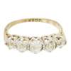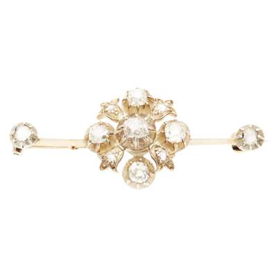 claw set with five graduated round brilliant-cut diamonds, to a plain yellow metal shank; together with another a diamond set bar brooch, set with a central cluster of old-round and rose cut-diamonds, the terminals each set with a rose-cut diamond, unmarked (2)