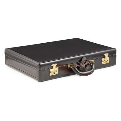 circa 1955, of traditional black leather rectangular form, the gilt metal fittings, stamped HÈRMES PARIS, with an orange dust draw string sleeve