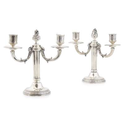 stamped Minerva head to base for Paris, the Corinthian column extending to two leaf clasped branches with circular sconces, the central finial designed as a rose bud, each raised on a circular foot with beaded and decorative border (2)