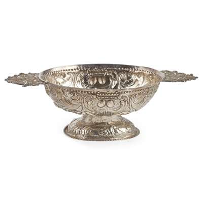 the bowl with tulip and foliate chased decoration with engraved date and import mark to rim, cast cherub and mask handles