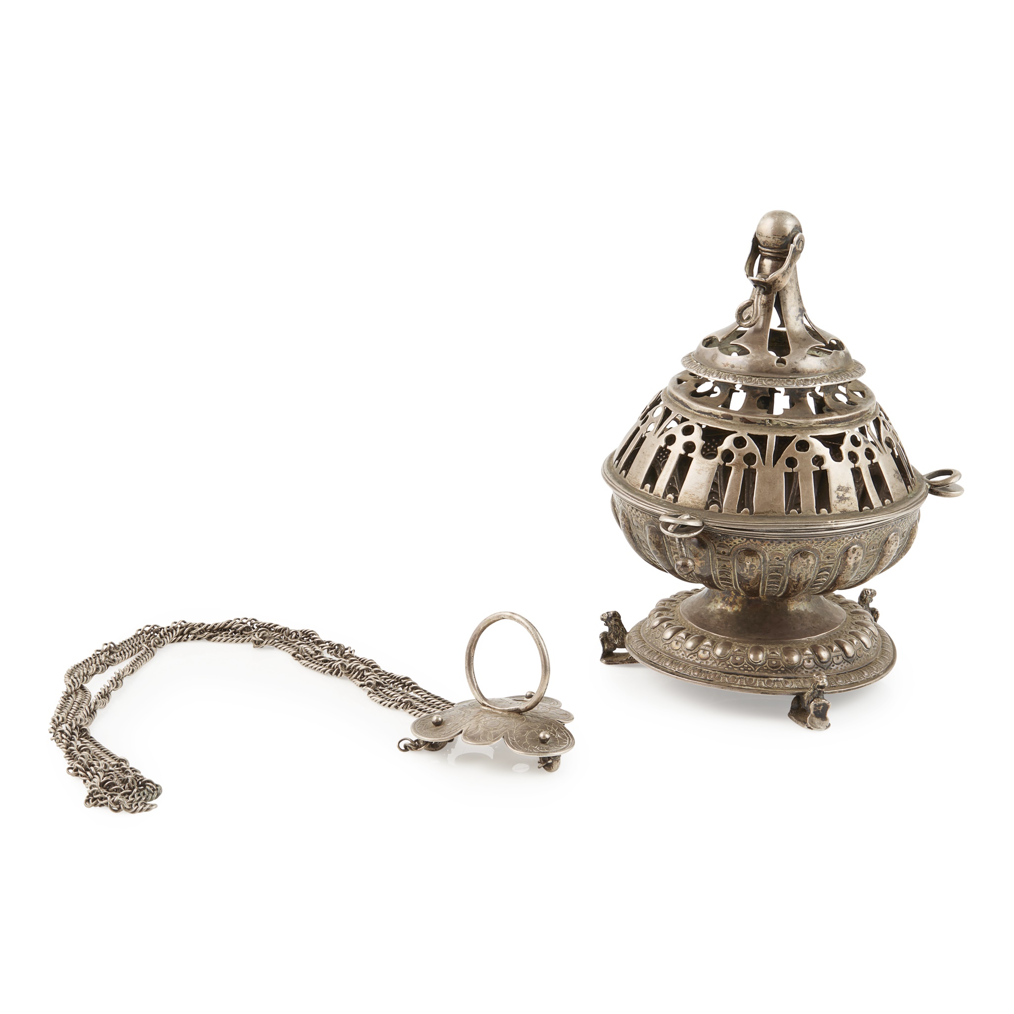circa 1700, the thurible bowl of fluted form raised on three cast lion feet, the pierced screw off domed lid with ball finial and links for three chain with loop handle