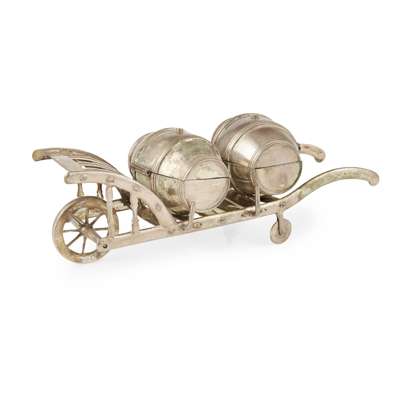 possibly Austro-Hungarian, 19th Century, modelled as a wheelbarrow with two hinged barrels for condiments, marked to arm of wheelbarrow