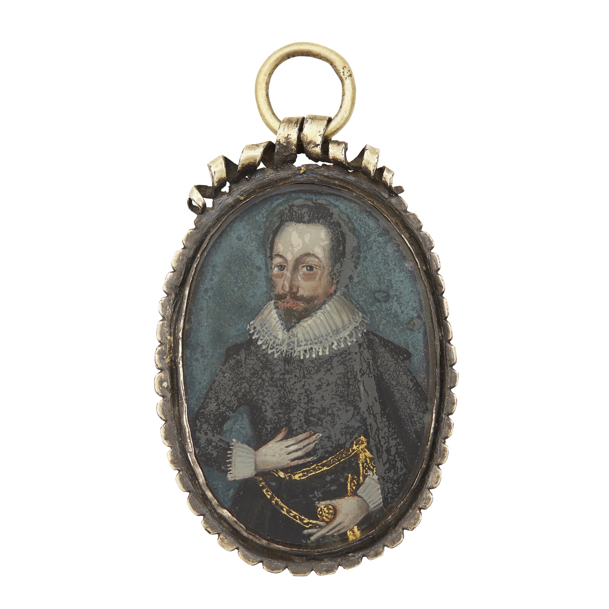 Spanish school, of a nobleman wearing a coat with full ruff, and a gold belt and court sword to his waist, reverse painted on glass within a silver gilt simple frame, slight ribbed border, scroll surmount with suspension loop