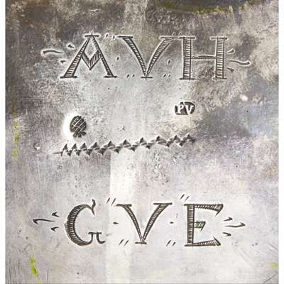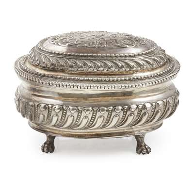 possibly Hannau, of demi-fluted oval form, gadrooned border, the underside with pricked initials A.V.H/ G.V.E. the pull off cover with similar decoration and embossed shell and foliate decoration to centre, raised on four cast paw feet