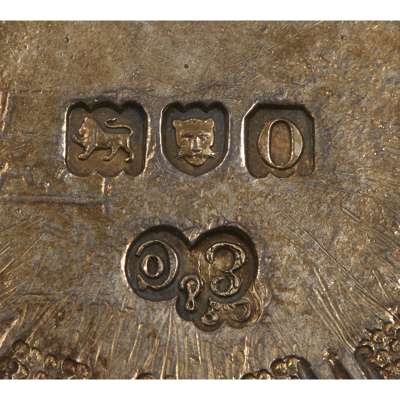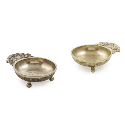 unmarked, 18th century, of conventional form, with flat handled modelled as armorials and supporters, the bowl with stippled panelling to the exterior, all on ball feet, together with an Edwardian cast copy, Elkington & Co., London, 1909 (2)