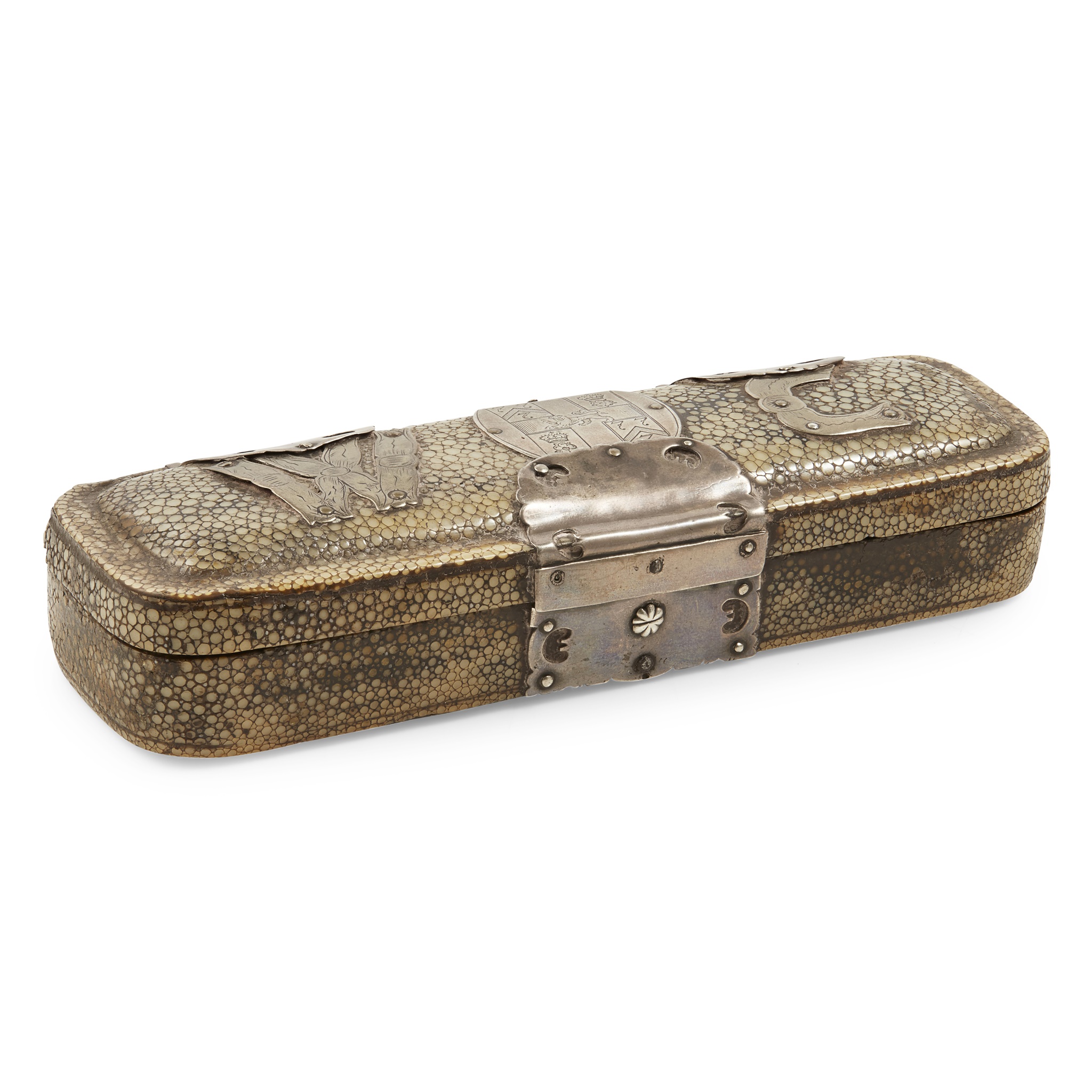 apparently unmarked, the rounded rectangular box and cover with shagreen, silver and other mounts, the shaped hinges and escutcheon and lock of plain outline and with pierced heart motifs, simple slide locking knob, the central panel simply engraved shield of armorials, with later onset initials W C, the interior lined with 'leather?' gilt detail of armorials as lid and various star and other motifs all in gilt