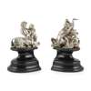 James Hunt, part marked London circa 1840, each modelled as a satyr, one on haunches holding a child figure, the other with a winged putto as a rider, all on shaped socle ebonised stands (2)