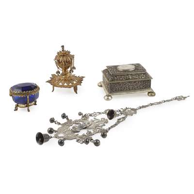 unmarked, the hinged cover with central miniature on card of winged putto, stepped sides to a base of plain rectangular form all raised on flattened ball feet, the whole with overlaid pierced, chased rectangular panels in the rococo manner of bold floral scrolls, portrait of male and female to each side; together with a 19th century gilt metal mounted octagonal box and cover with deep blue glass body and cover, unmarked; a gilt filigree small table inkwell modelled as a stylised flower an cover, with chain swags, spreading open base (3)