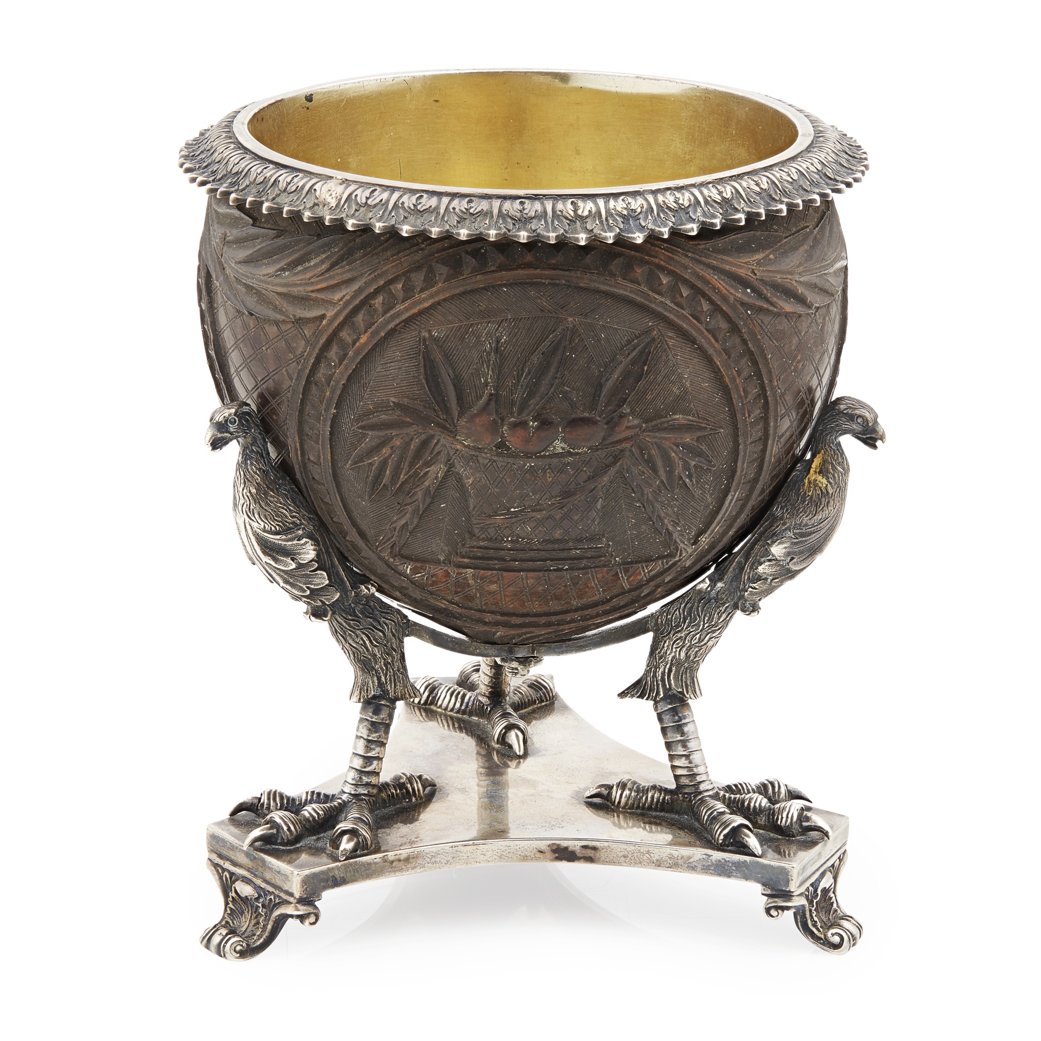 Robert Hennell, London 1827, the coconut carved with three ovals of plants, basket of flowers, parted curtains with heart pierced by arrow on a plinth, silver gilt liner, cast leaf border, the cup supported by bold birds on monopod legs with claw foot, concave triangular base, scroll shell feet