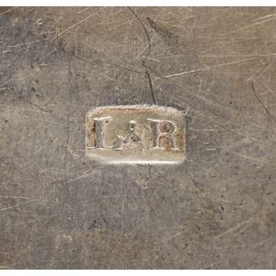 the hexagonal white metal bases with stamped mark L&R, loop handle, engraved crest and central candle holder, with a later Sheffield plate ring for holding a candle shade (2)