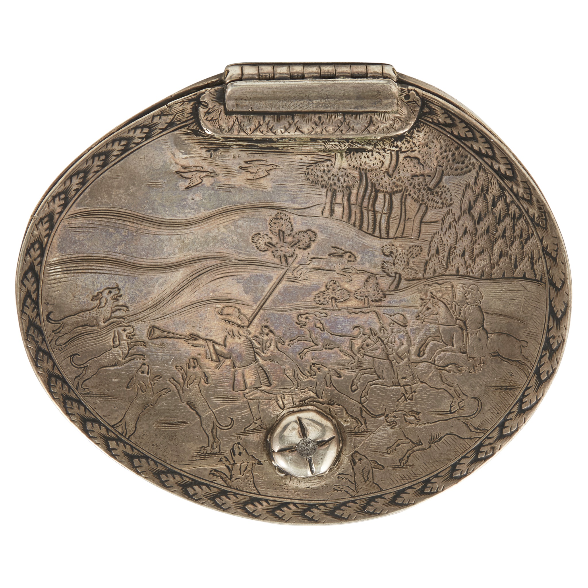 apparently unmarked, the oval flat lid with sliding knob and an engraved scene of hare coursing on horse back, leaf clasped border, simple hinge