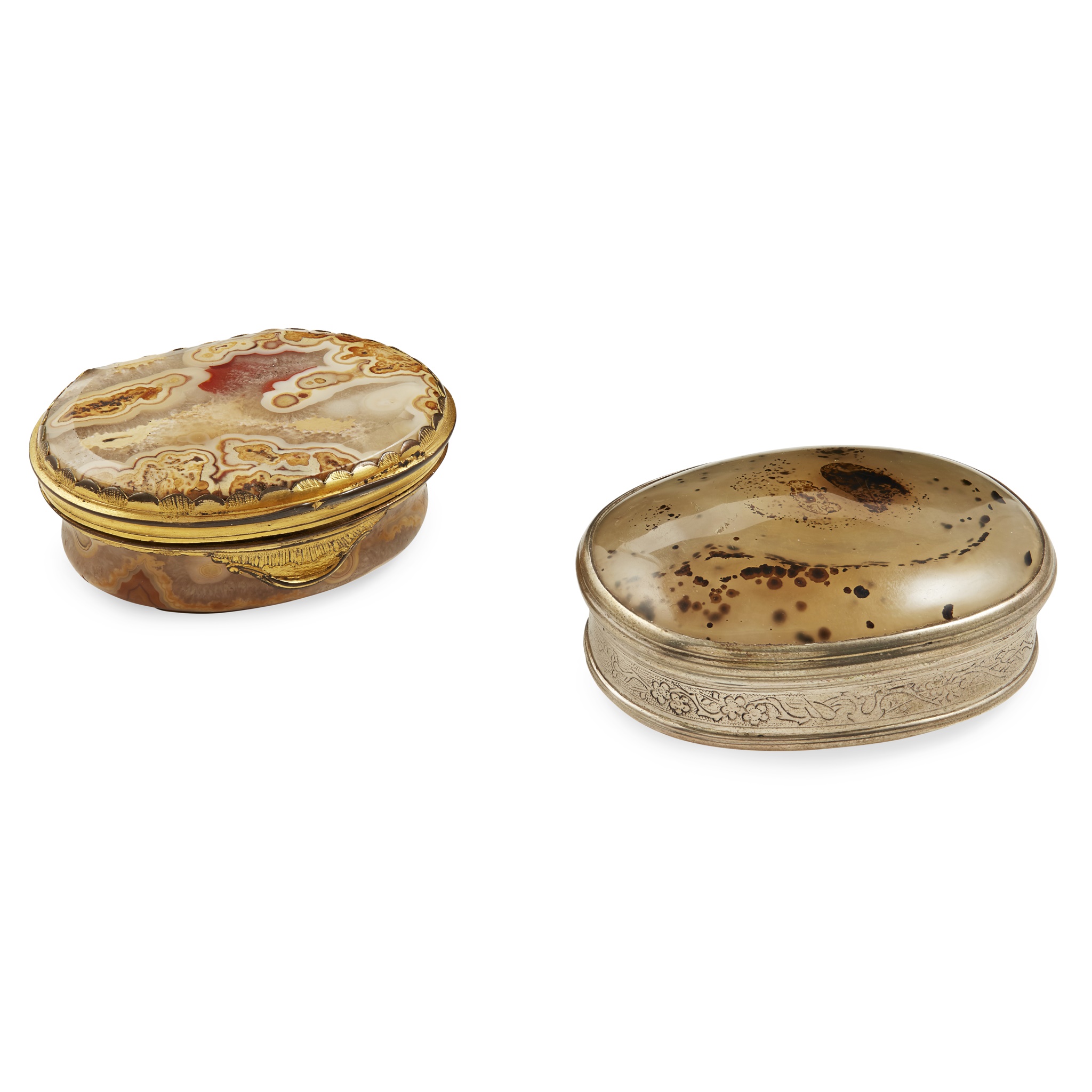 unmarked the oval box with plain frame work to the agate base and top, slight moulded detail to the frame, the sides with engraved branch and flower design, the other with carved out agate base and cover, the well patterned agate in gilt ormolu mounts, slight scallop detail with scroll thumb piece (2)