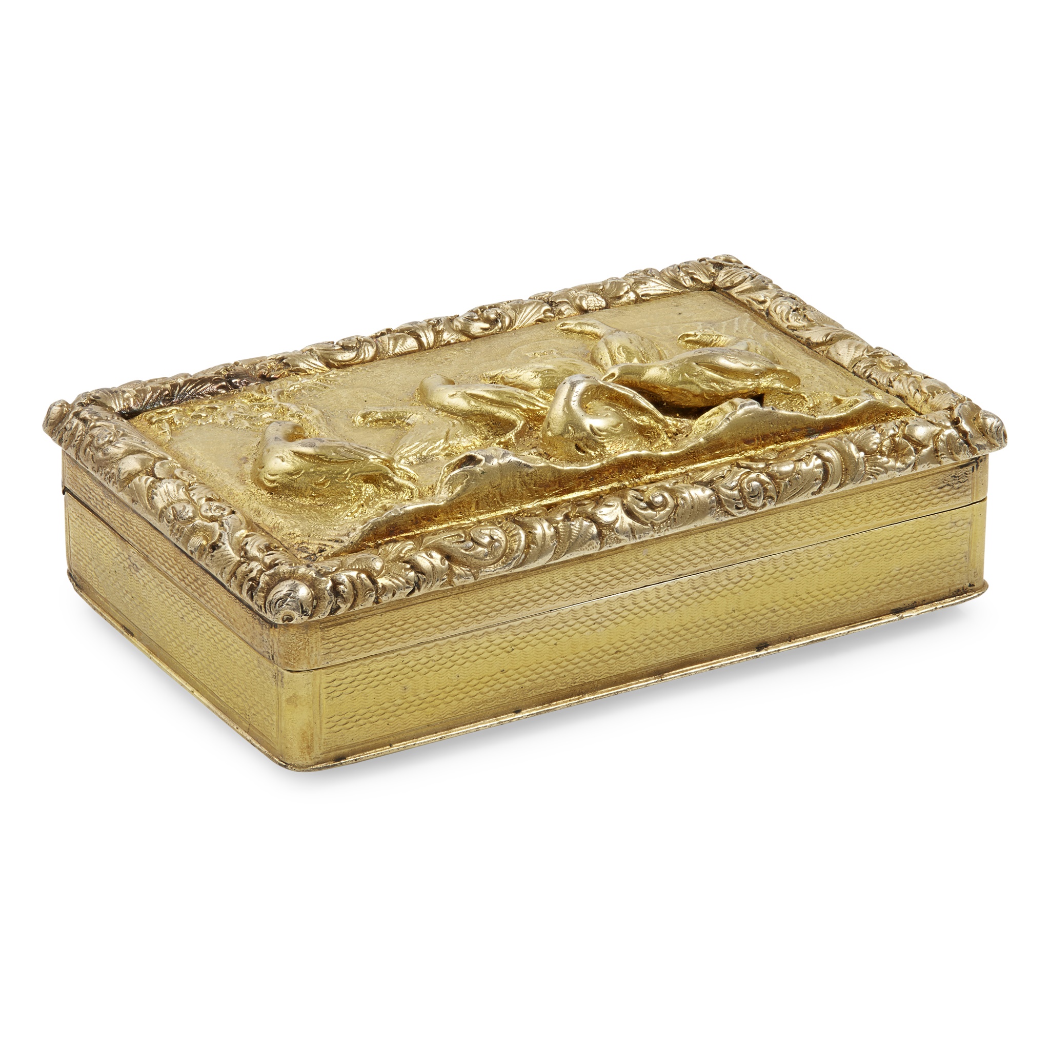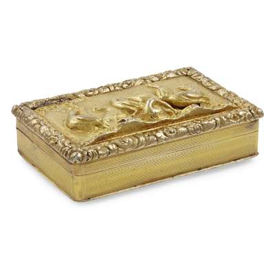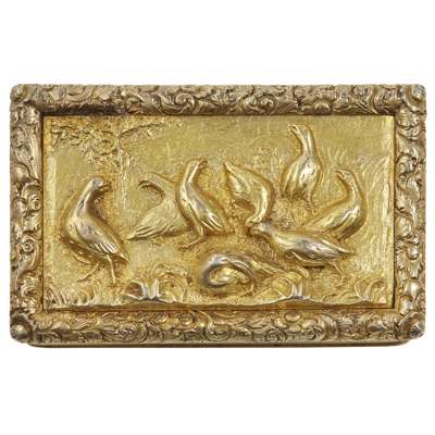 William Simpson, Birmingham 1829, of rectangular form, the hinged cover with cast group of partridges in a rural setting, cast foliate border, engine turned sides and base, gilt interior
